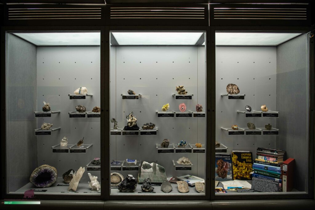 Med minerali so številni vrhunski in kakovostni primerki iz svetovno znanih nahajališc, med katerimi so številna iz Brazilije, Indije in Avstralije. Med njimi posebej izstopajo kristali kremenov, brazilianita, cavansita, dravita in drugih. Kakovostni in znacilni primerki mineralov iz evropskih in slovenskih nahajališc dopolnjujejo mineraloško pestrost zbirke. Med kamninami so predvsem primerki iz Slovenije, najmanj je fosilov. V zbirki je 305 vzorcev mineralov, 118 vzorcev kamnin in 14 vzorcev fosilov.